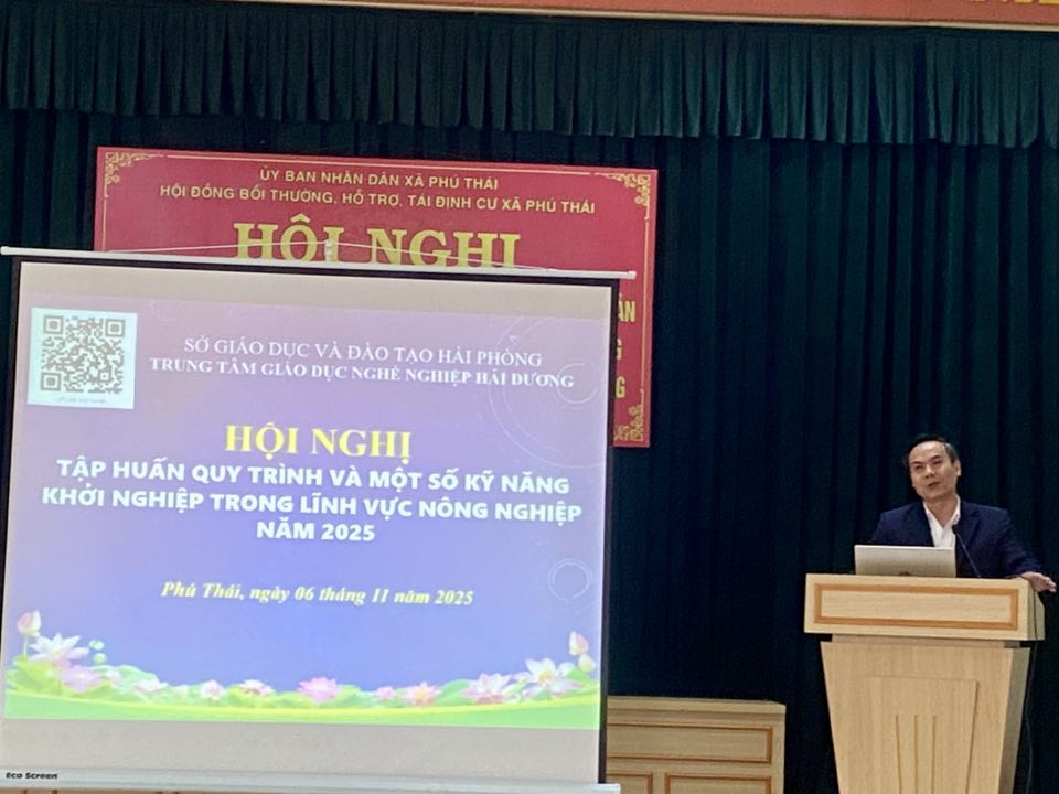 Sáng ngày 06/11, tại hội trường UBND xã Phú Thái, Hội Nông dân xã Phú Thái phối hợp với Trung tâm Giáo dục Nghề nghiệp Hải Dương tổ chức Hội nghị Tập huấn quy trình và một số kỹ năng khởi nghiệp trong lĩnh vực nông nghiệp năm 2025.