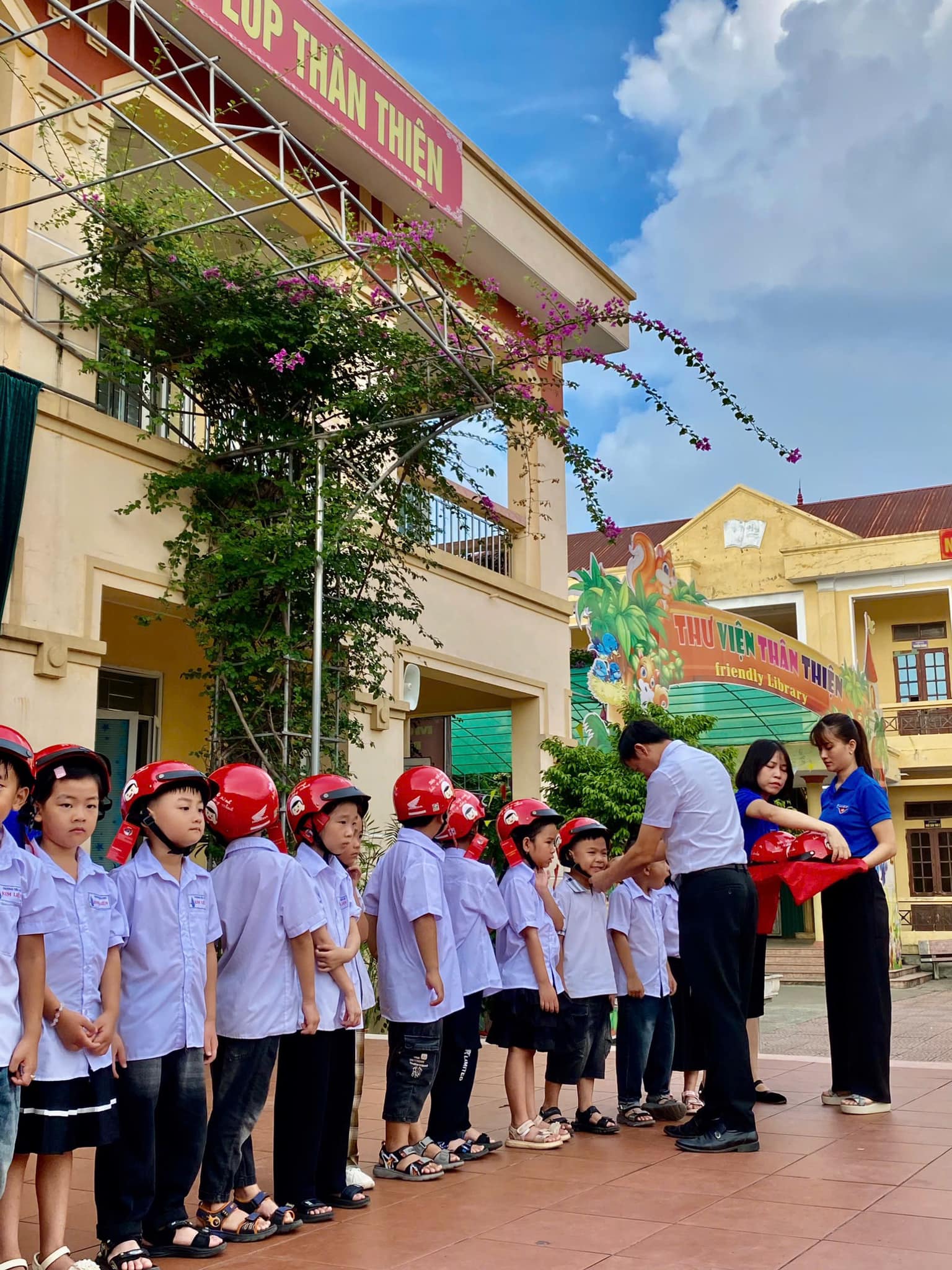 Với tinh thần xung kích – trách nhiệm – lan tỏa yêu thương, Đoàn Thanh niên nhà trường đã tích cực đồng hành cùng chương trình: hỗ trợ công tác tổ chức, hướng dẫn các em học sinh đội mũ đúng quy cách, cùng các con tham gia trò chơi tìm hiểu kiến thức về an toàn giao thông, mang đến không khí vui tươi – bổ ích – giàu ý nghĩa giáo dục. Buổi trao tặng mũ không chỉ là một hoạt động thiết thực, mà còn là bài học đầu tiên về ý thức an toàn giao thông cho các em học sinh lớp 1 – những mầm non mới chập chững bước vào ngôi trường tiểu học thân yêu.