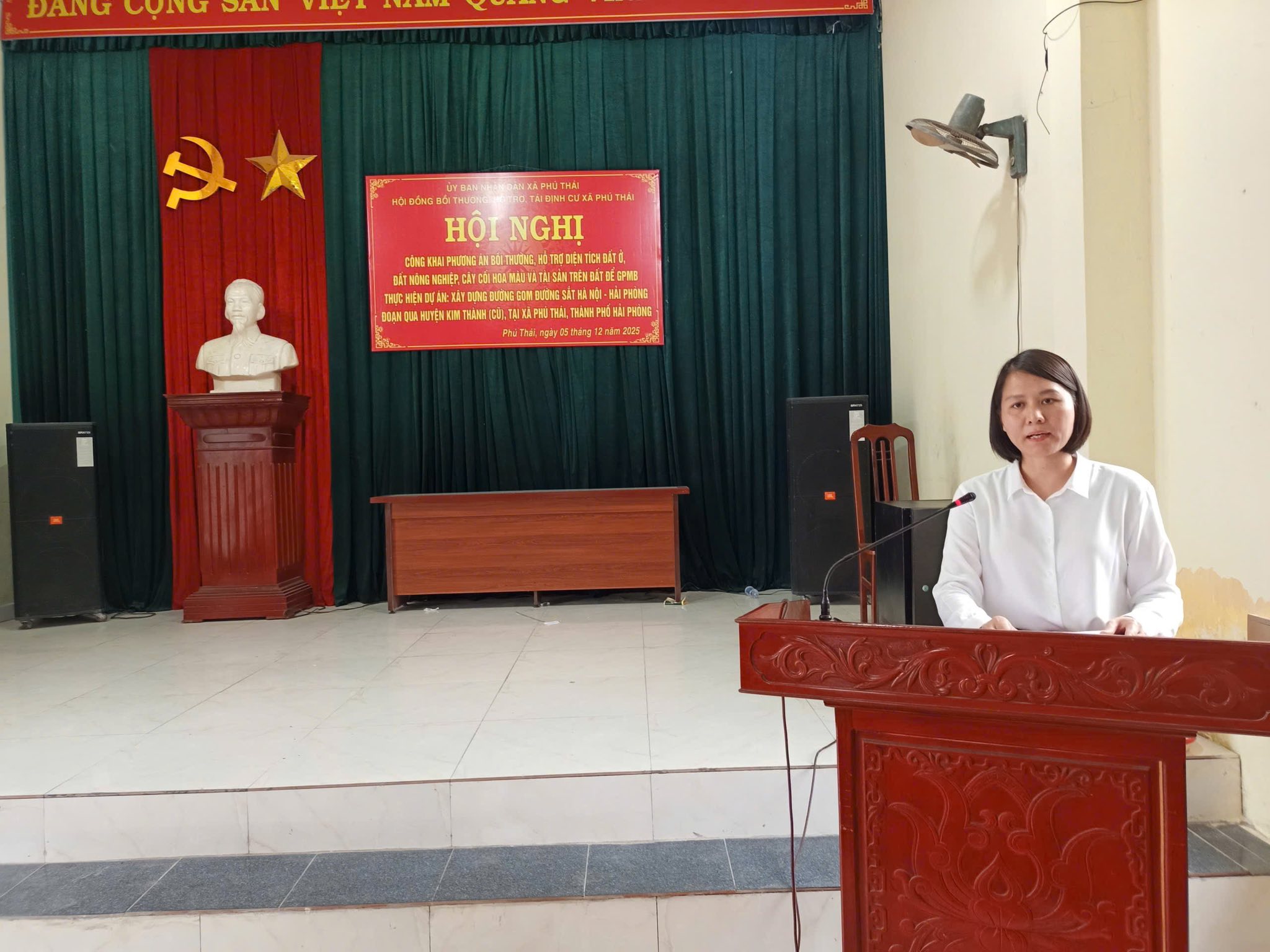 Chiều ngày 05 tháng 12 tại nhà văn hoá thôn Phương Duệ, xã Phú Thái. Hội đồng bồi thường, hỗ trợ tái định cư (HĐBT, HT, TĐC), tổ chức hội nghị công khai phương án bồi thường, hỗ trợ diện tích đất ở, đất nông nghiệp, cây cối hoa màu và tài sản trên đất để giải phóng mặt bằng (GPMB), thực hiện dự án xây dựng đường gom, đường sắt Hà Nội – Hải Phòng đoạn qua huyện Kim Thành (cũ). Đồng chí Lê Thị Thùy Vân – UVBTV; Phó chủ tịch ủy ban nhân dân; Chủ tịch Hội đồng bồi thường, hỗ trợ tái định cư xã chủ trì hội nghị.