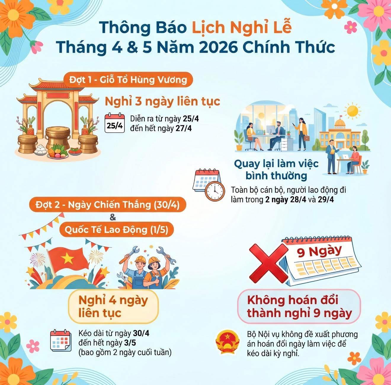 Liên quan đến việc cán bộ, công chức, viên chức, người lao động có thể được nghỉ liên tục nhiều ngày trong dịp nghỉ lễ Giỗ Tổ Hùng Vương, Ngày Giải phóng miền Nam, thống nhất đất nước (30/4) và Ngày Quốc tế Lao động (1/5) năm 2026 thông qua việc hoán đổi ngày làm việc với ngày nghỉ hằng tuần, chiều ngày 10/4, Thứ trưởng Bộ Nội vụ Nguyễn Mạnh Khương khẳng định không có phương án hoán đổi ngày làm việc để nghỉ liền 9 ngày trong dịp nghỉ lễ Giỗ Tổ Hùng Vương và nghỉ lễ 30/4, 1/5.