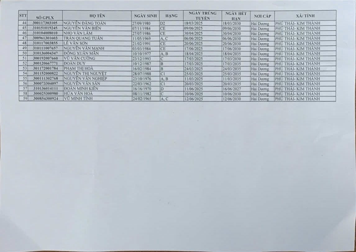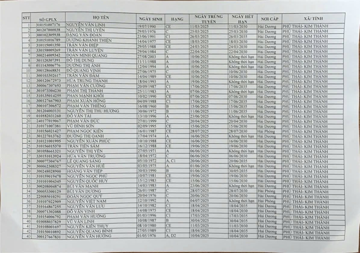 - Đề nghị các công dân có tên trong danh sách đến trực tiếp Công an xã Phú Thái để nhận Giấy phép lái xe theo quy định.