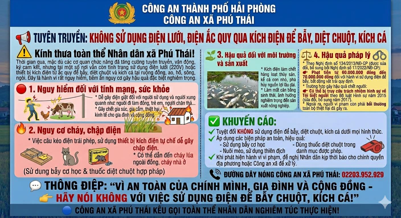 Công an xã Phú Thái vận động nhân dân không sử dụng điện lưới (220V) hoặc thiết bị kích điện từ ắc quy để bẫy, diệt chuột và kích cá tại ruộng đồng, ao, hồ, sông, ngòi.