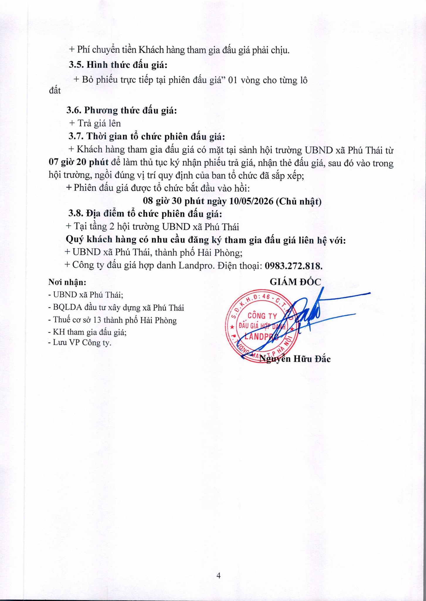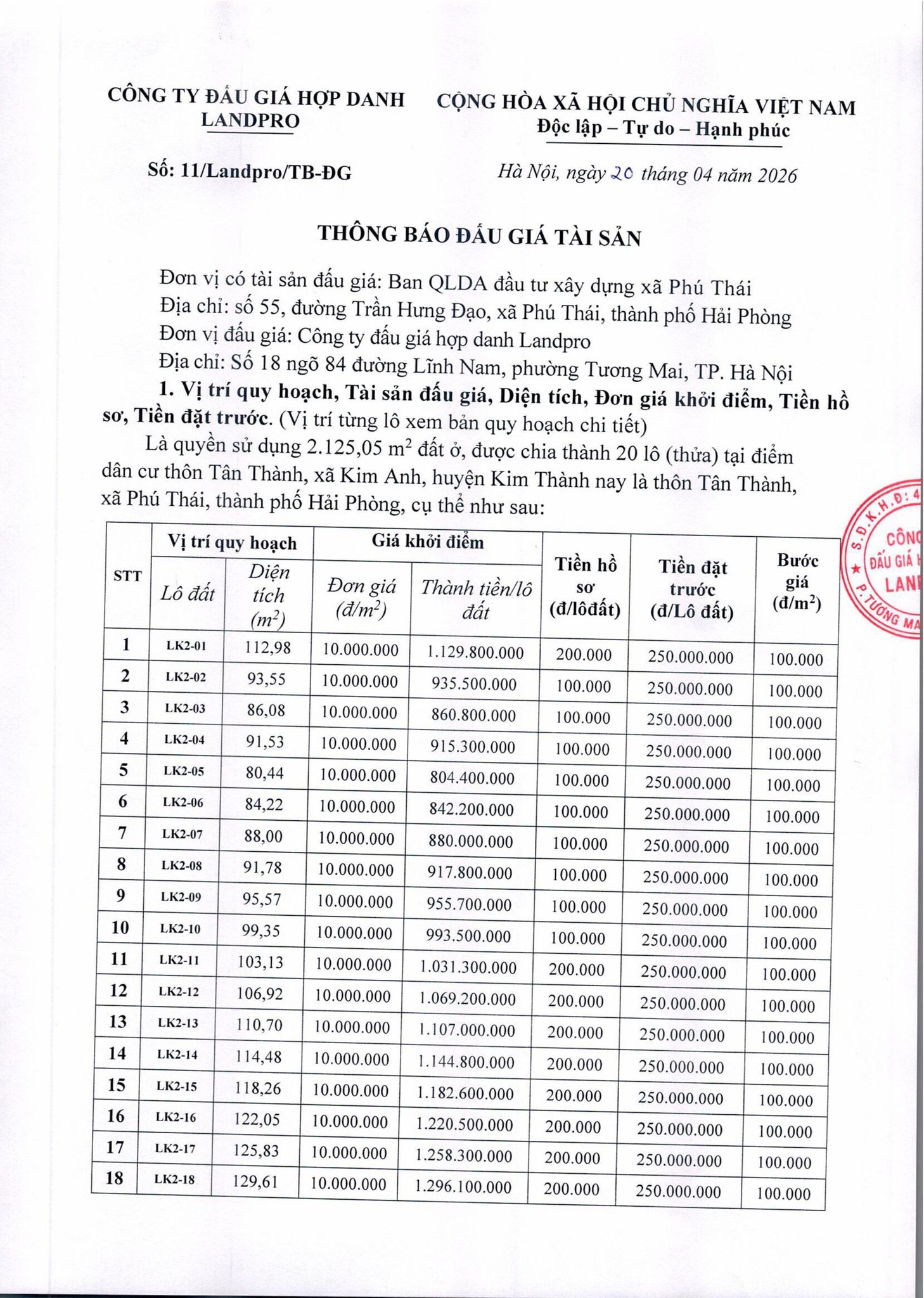 Thông báo đấu giá tài sản KDC thôn Tân Thành, xã Phú Thái.