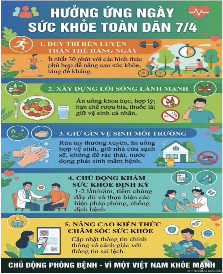 Hưởng ứng Ngày Sức khỏe toàn dân 07/4/2026, không chỉ là hoạt động mang tính phong trào mà còn là lời nhắc nhở sâu sắc về trách nhiệm của mỗi cá nhân đối với bản thân, gia đình và xã hội. Một cộng đồng khỏe mạnh chỉ có được khi mỗi người dân đều có ý thức tự giác bảo vệ và nâng cao sức khỏe của mình. Mỗi người dân hãy bắt đầu từ những hành động nhỏ nhất, thiết thực nhất để xây dựng một cộng đồng khỏe mạnh, góp phần vì một Việt Nam phát triển bền vững và tươi sáng./.