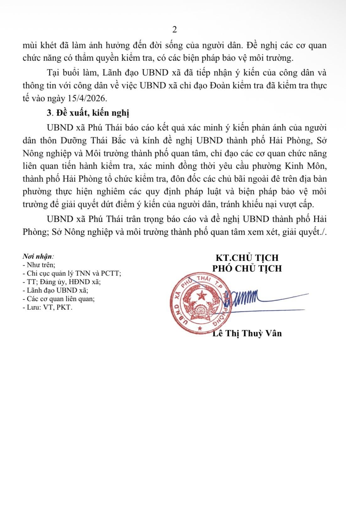 Trước thực trạng trên, UBND xã Phú Thái đã nhanh chóng thành lập đoàn kiểm tra để xác minh, đánh giá mức độ ô nhiễm. Qua kiểm tra thực tế, chính quyền địa phương ghi nhận những tồn tại cần được xử lý khẩn trương. UBND xã đã làm việc với UBND Phường Kinh Môn và công văn gửi UBND thành phố Hải Phòng, Sở Nông nghiệp và môi trường đề nghị chỉ đạo các cơ quan chức năng sớm vào cuộc, đưa ra biện pháp khắc phục, nhằm đảm bảo môi trường sống và sức khỏe cho người dân khu vực.